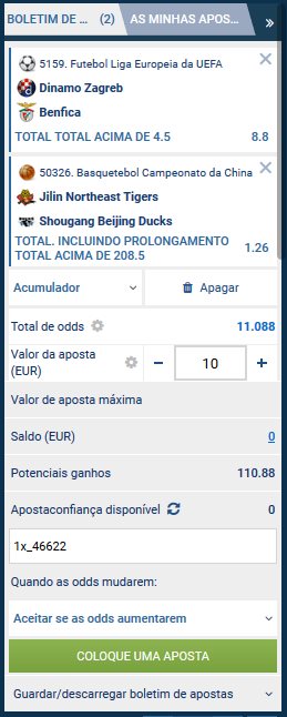 Então, para cada Real que você jogar terá o valor multiplicado pelo odds/cota total. Jogando 10€ você terá a possibilidade de ganhar 946,1€. Mas, se você errar somente um resultado do bilhete, na prática você não vai ganhar nada, a menos que você tenha criado um sistema específico ou consiga jogar com uma margem de erro que permite que você ganhe alguma coisa, mesmo em caso de erro na previsão final.